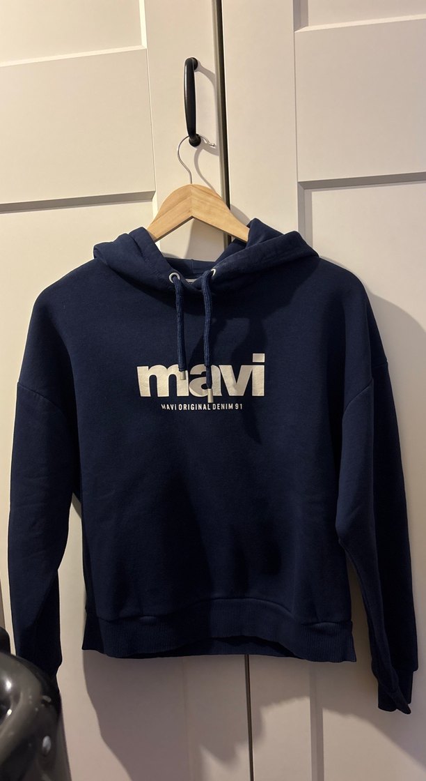 Mavi markasına ait kapüşonlu, uzun kollu, baskılı ve kadife detaylı lacivert sweatshirt. Rahat kesimiyle günlük kullanıma uygundur.