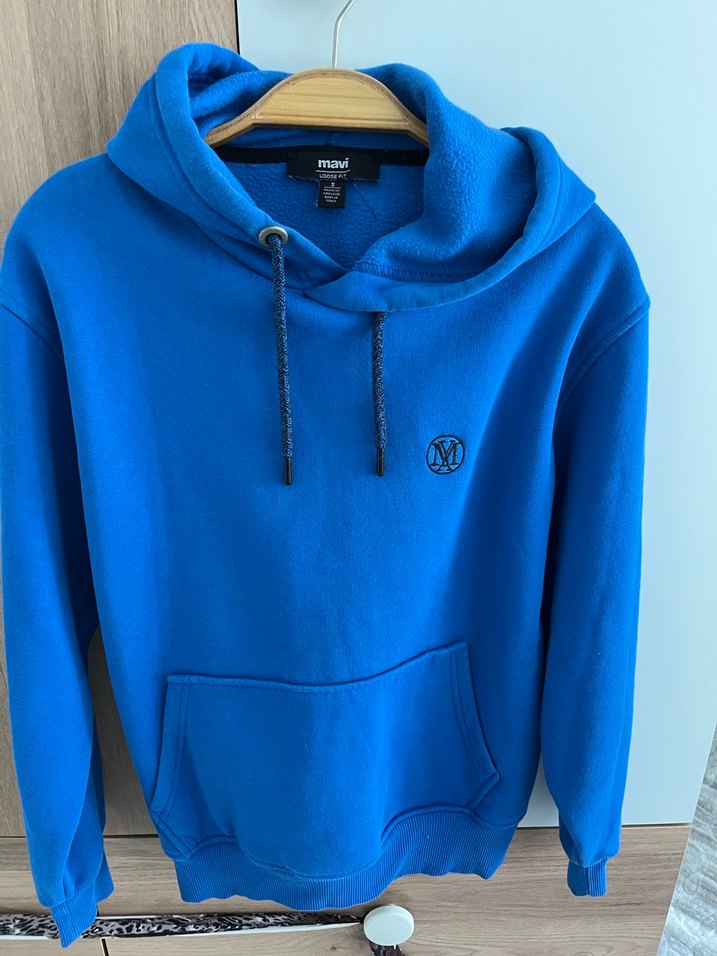 Bol kesim, mavi renkli, kapüşonlu ve uzun kollu sweatshirt. Yumuşak ve sıcak kumaştan, fermuarlı detaylı, günlük rahat kullanım için uygundur.
