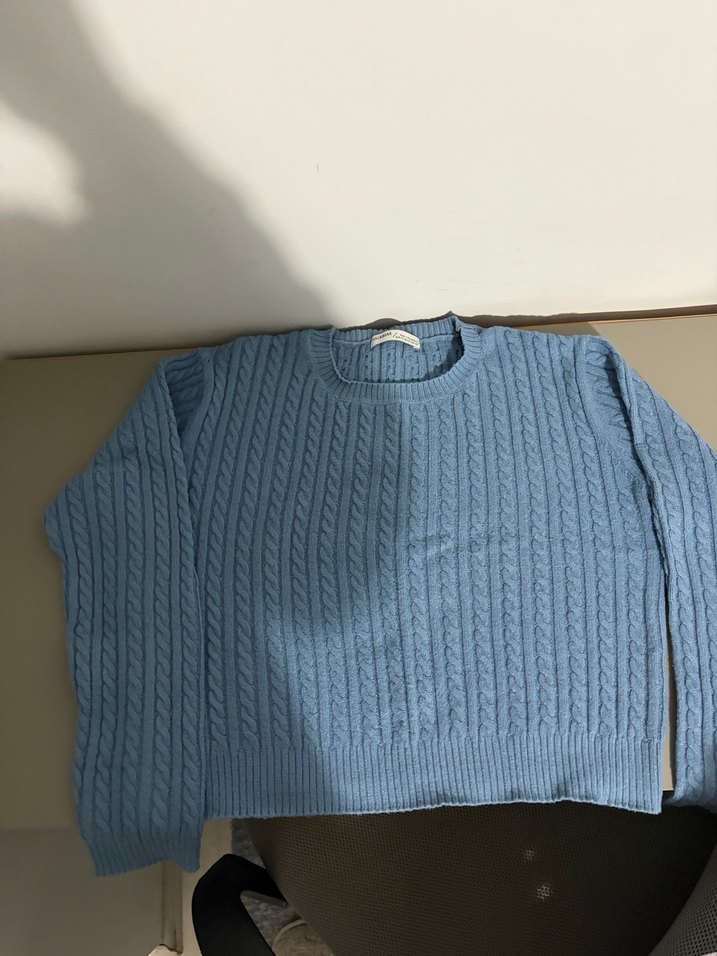 Mavi örgü desen kadın kazağı, yuvarlak yaka ve uzun kollu tasarıma sahiptir. Rahat kesimi ve yumuşak dokusu günlük kullanım için uygundur. Pull & Bear markadır hiç giyilmedi hiç bir sorun yoktur