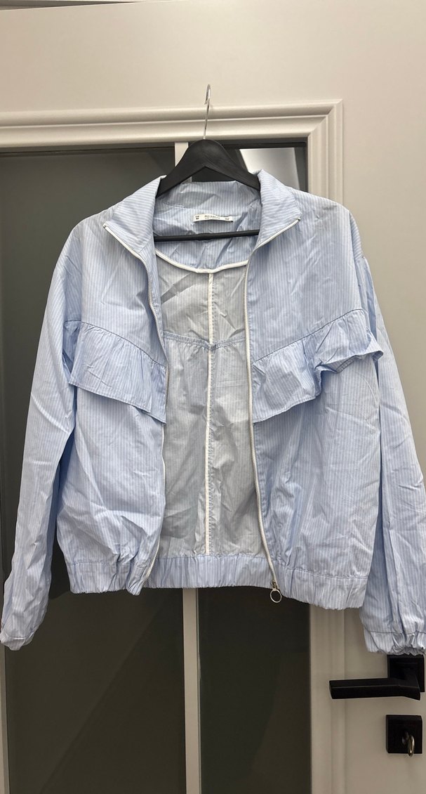 Pastel mavi renkte, keten kumaştan, fermuarlı ve notched lapel yakalı bol kesim kadın ceket. Uzun kollu, midi boy ve günlük kullanıma uygun. Çok az kullanıldı defosu yok