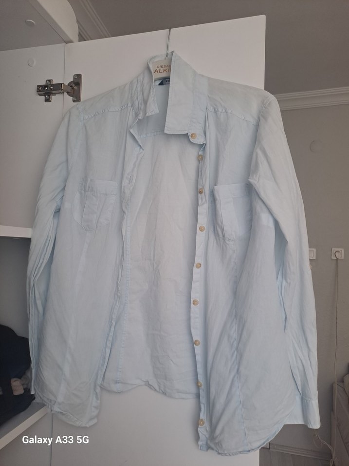 Mavi keten kumaştan, yakalı ve uzun kollu, bol kesim kadın gömleği. Düğmeli önde ve günlük rahat sokak stili için uygun.