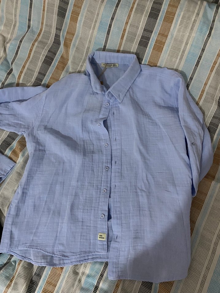 Mavi keten kumaştan, düğmeli, uzun kollu, yakalı ve bol kesim kadın gömleği. Günlük rahat kullanım için uygundur.