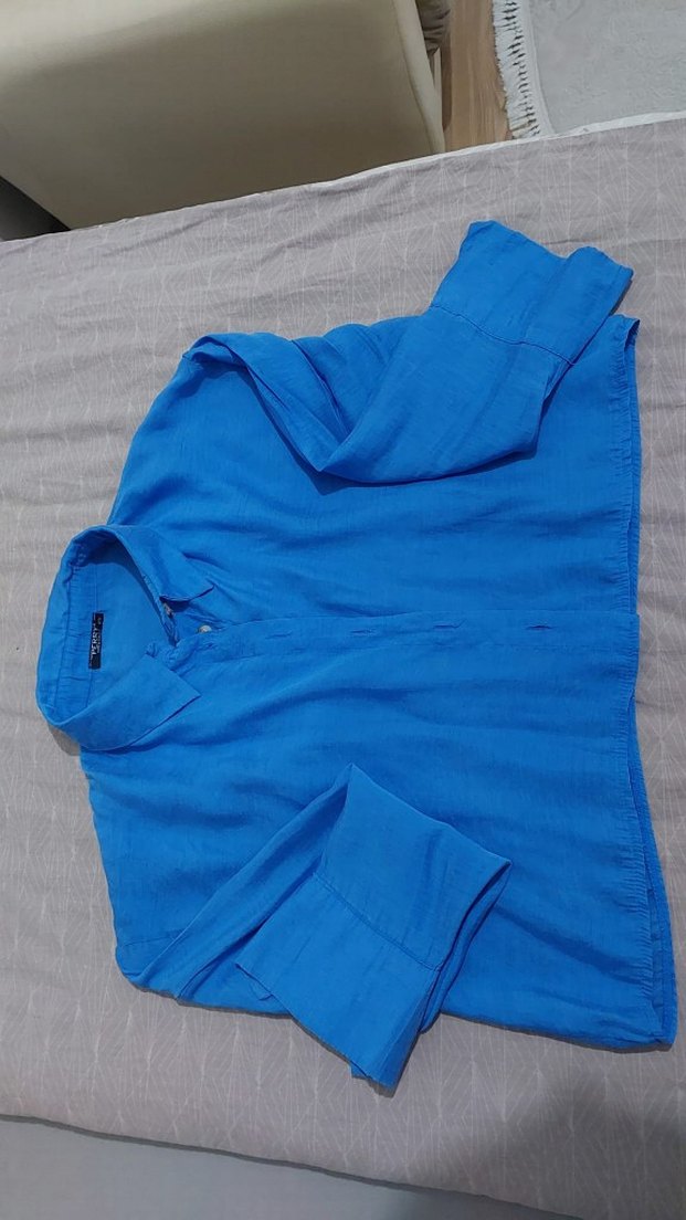 Mavi keten kumaştan uzun kollu, yakalı, düğmeli ve bol kesim kadın gömleği. Günlük rahat kullanım için uygundur.