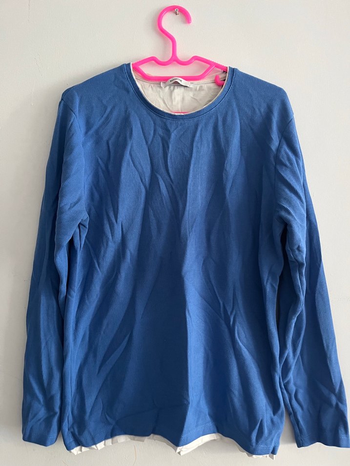 Kadınlar için uzun kollu, yuvarlak yakalı ve keten kumaştan yapılmış pastel mavi renkte salaş kesim sweatshirt. Minimalist ve günlük kullanıma uygun, 'S' işaretli.