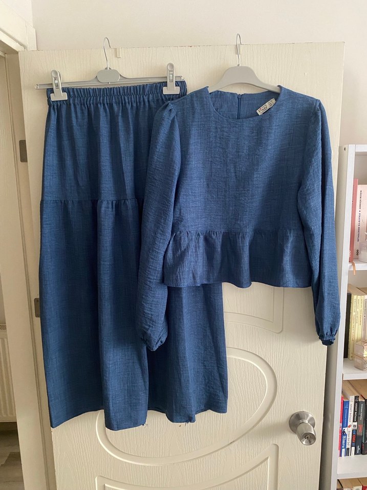Kadın keten kumaştan, uzun kollu ve bisiklet yaka bluz ile pileli uzun etekten oluşan mavi rahat bir takım. Günlük kullanıma uygun.