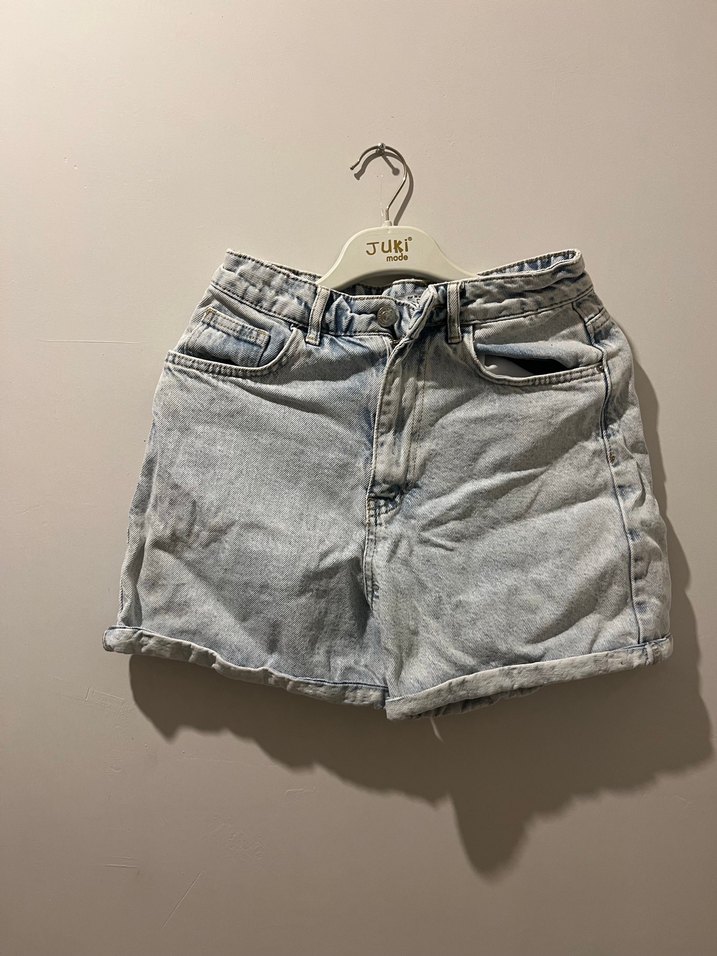 Mavi renk, kısa ve bol kesim denim şort. Günlük kullanıma uygun, rahat ve şık bir sokak stili parçası.