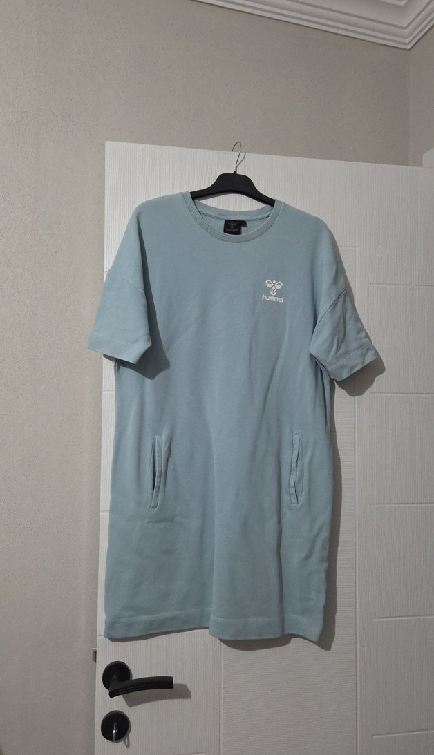 Mavi pastel renk, kısa kollu, salaş kesim elbise Yumuşak ve sıcak kumaş, crew neck ve cep detaylarına sahip. Günlük kullanım için uygun.