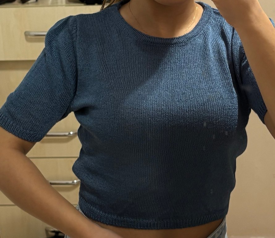 Mavi parlak renkte, kısa kollu, yuvarlak yakalı ve triko denim kumaştan yapılmış, normal boyda, vücuda oturan kadın kazak. Günlük kullanıma uygundur.