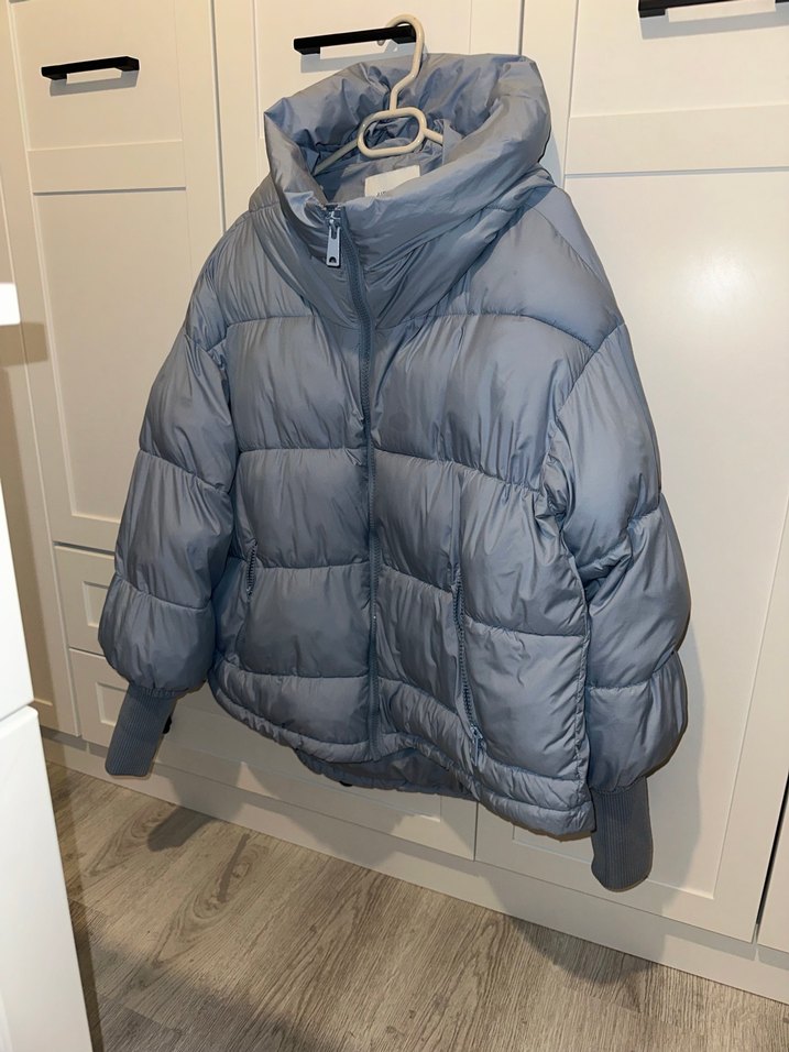 Mavi renkte, yüksek yakalı,oversayz , yumuşak kumaştan kadın kışlık mont.