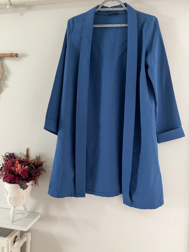 Mavi renkli, midi boy, dökümlü ve parlak kumaştan yapılmış, notched lapel yakalı, bol kesim kadın ceketi. Uzun kolludur ve ofis için uygundur.