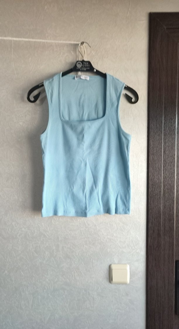 Mavi kolsuz atlet, kare yakalı ve kısa boylu, pamuklu kumaştan yapılmıştır. Günlük kullanım için sade ve rahat bir görünüm sunar.Kucuk aldığım için bir iki ancak giyebildim evde giyim için almistim