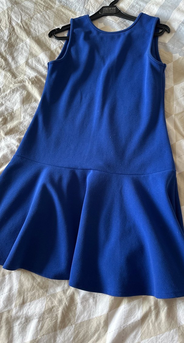 Mavi, kolsuz, vücuda oturan elbise. Etek kısmında fırfır detayı ve yuvarlak yaka bulunur. Parlak dokusuyla günlük kullanıma uygundur. Sırtı v yaka