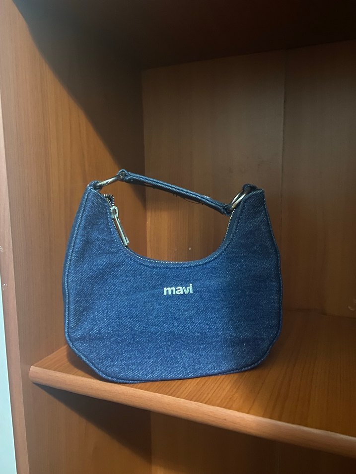 Mavi kot kumaştan yapılmış, fermuarlı ve minimalist baskılı tasarıma sahip kadın çantasıdır. Günlük sokak stiline uygundur. Çanta zinciride mevcuttur