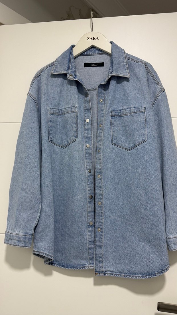 Mavi marka, düğmeli, uzun kollu, bol kesim mavi-gri tonlarda kadın kot ceket. İki ön cepli, normal boyda, günlük kullanıma uygun rahat bir model.