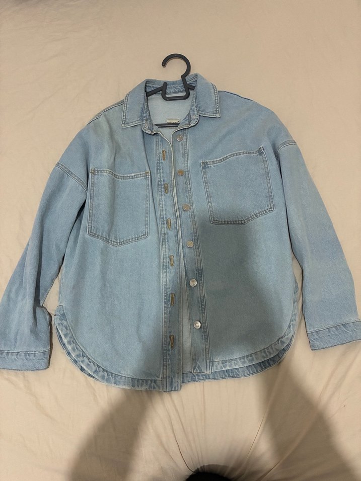 Düğmeli, uzun kollu, mavi denim ceket. Rahat kesimi ve çıtçıtlı önü ile günlük kullanıma uygun casual tarzda.