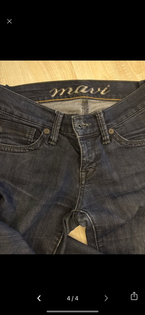 Mavi markalı koyu renkli, kemerli, normal midi boy, sıkı kesim kadın kot pantolon. Günlük rahat kullanıma uygundur.