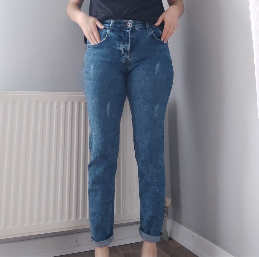 Mavi denimden üretilmiş, rahat kesim, kadın kot pantolon. Günlük kullanım için uygundur.