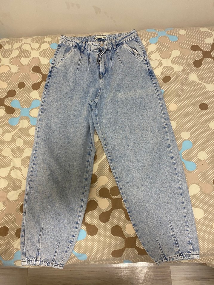Düğmeli, bağcıklı bel ve pastel mavi batik desenli bol kesim kadın kot pantolon. Midi boy, rahat ve günlük kullanıma uygun. 38 de olur