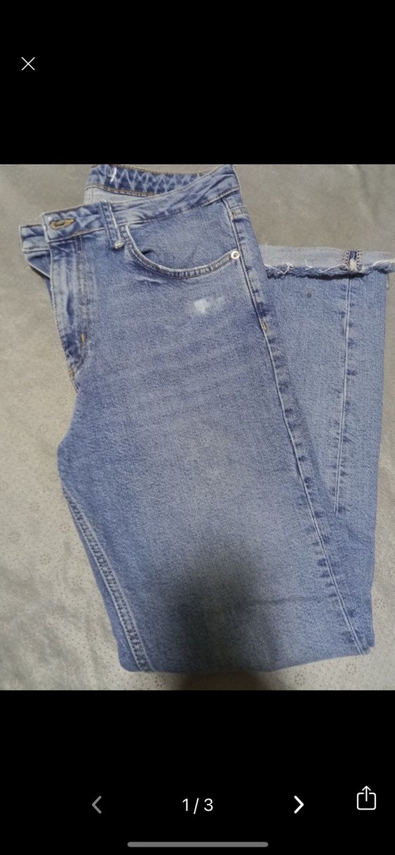 Mavi kot kumaştan, midi boy ve yırtmaç detaylı, rahat kesim kadın pantolon. Günlük sokak stili için uygundur. 60 kiloya kadar olur resimde görüldüğü gibi ufak bi lekesi var ve yırtmaçı var