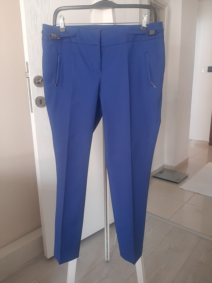 Mavi kadın kumaş pantolon, düzenli kesim, fermuarlı cepler ve parlak yüzeye sahip, ofis ve sokak stiline uygun.