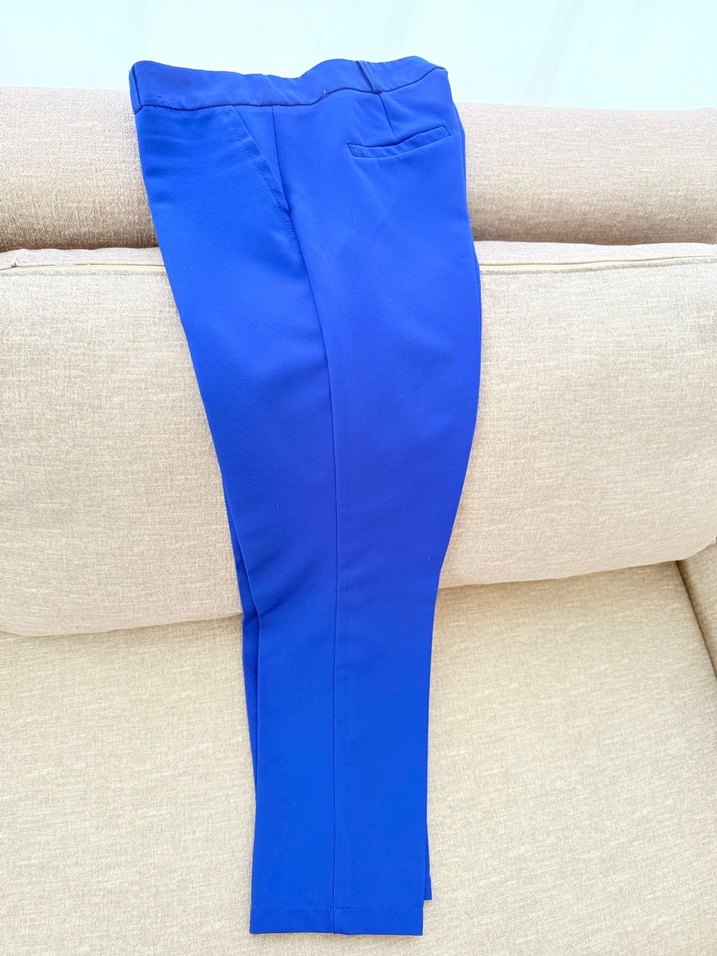 Ürün tertemizdir . Hiçbir defosu yoktur.Mavi renkli, normal boy midi kadın kumaş pantolon. Sentetik kumaştan, fermuarlı, sade ve desen içermeyen tasarımıyla ofis kullanımı için uygundur.