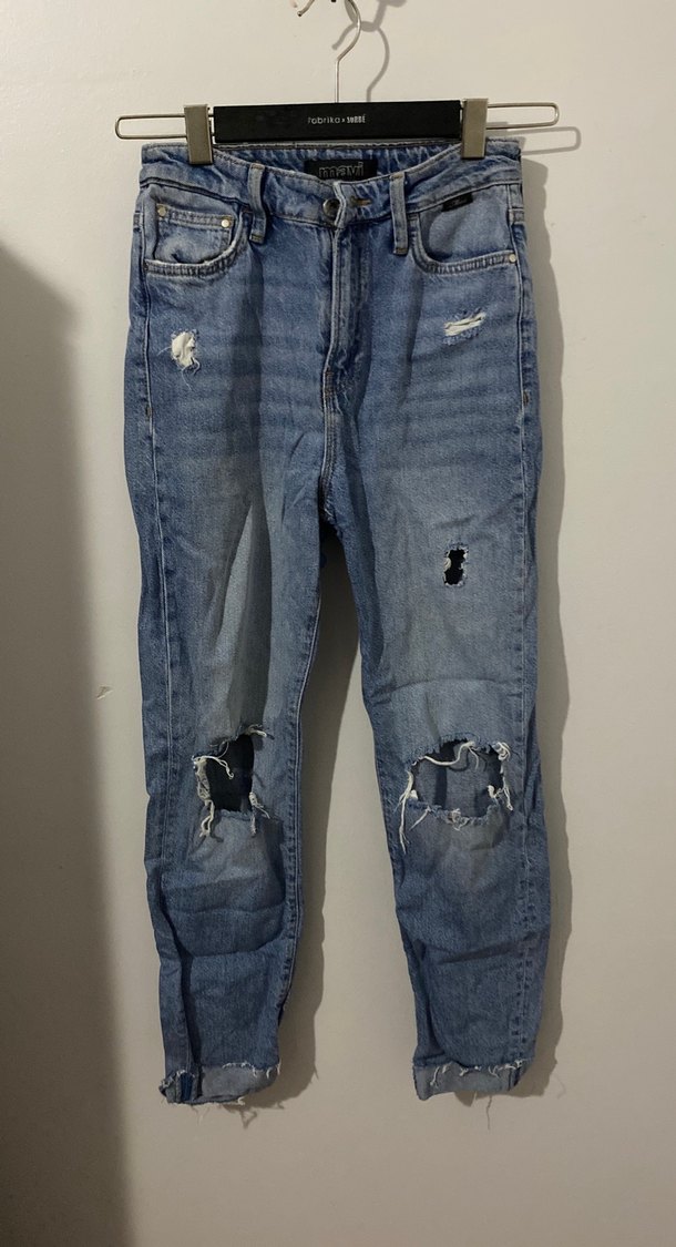 Kadınlar için lacivert kot pantolon, bol kesim ve normal boy. Tokalı detaylar ve yırtıklar ile günlük sokak stili için uygundur.