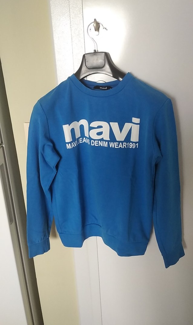 Mavi renkli, uzun kollu, bisiklet yaka ve bol kesim sweatshirt. Triko denim kumaştan, önünde baskılı logo bulunur. Günlük rahat kullanıma uygundur. ✨