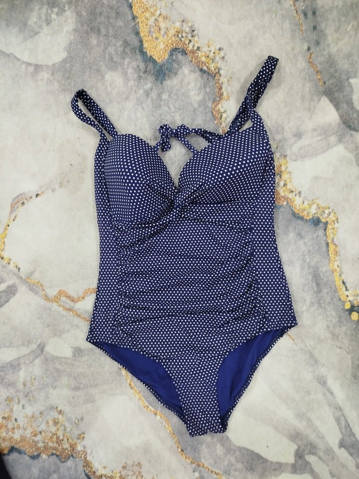 Kadın lacivert sırt detaylı mayo. Etikette 54 yazıyor ama 46-48 beden uyumlu. Askı ayarlanabilir. Göğüs altından bel 38 cm ama baya esnek kumaş.