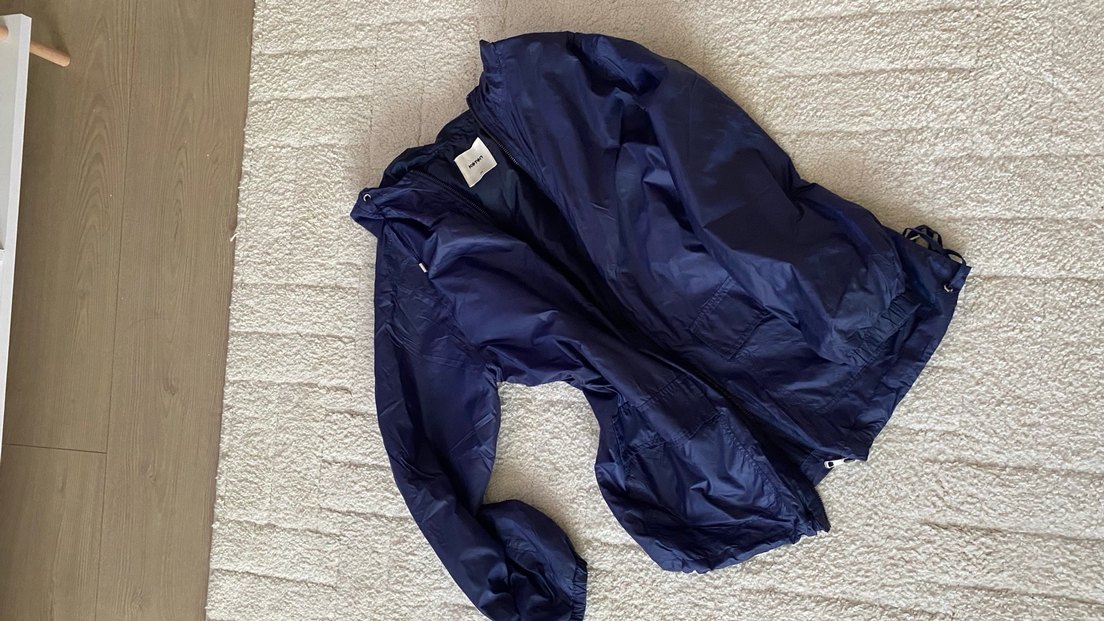 Çok uyguna ekledim. Parlak mavi sentetik kumaştan yapılmış, çıtçıtlı yakalı ve fermuarlı midi boy rüzgarlık. Bol kesim, uzun kollu, günlük kullanım için uygundur. ️