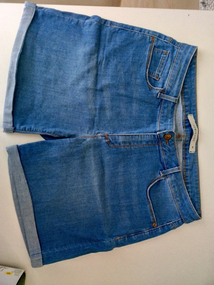 Mavi midi uzunlukta, bol kesim kadın denim şort. Rahat ve şık, günlük ve sokak stiline uygun.