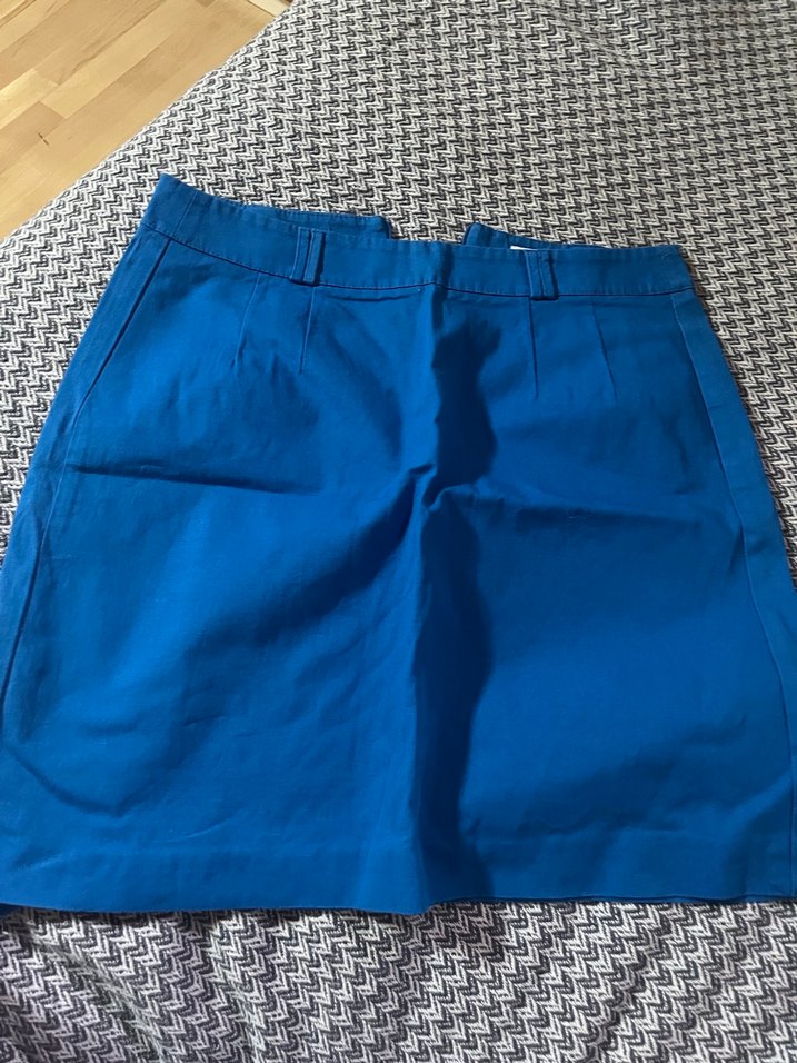 Parlak mavi renkte, kemerli ve sentetik kumaştan yapılmış, iş ortamına uygun, vücuda oturan midi etek.