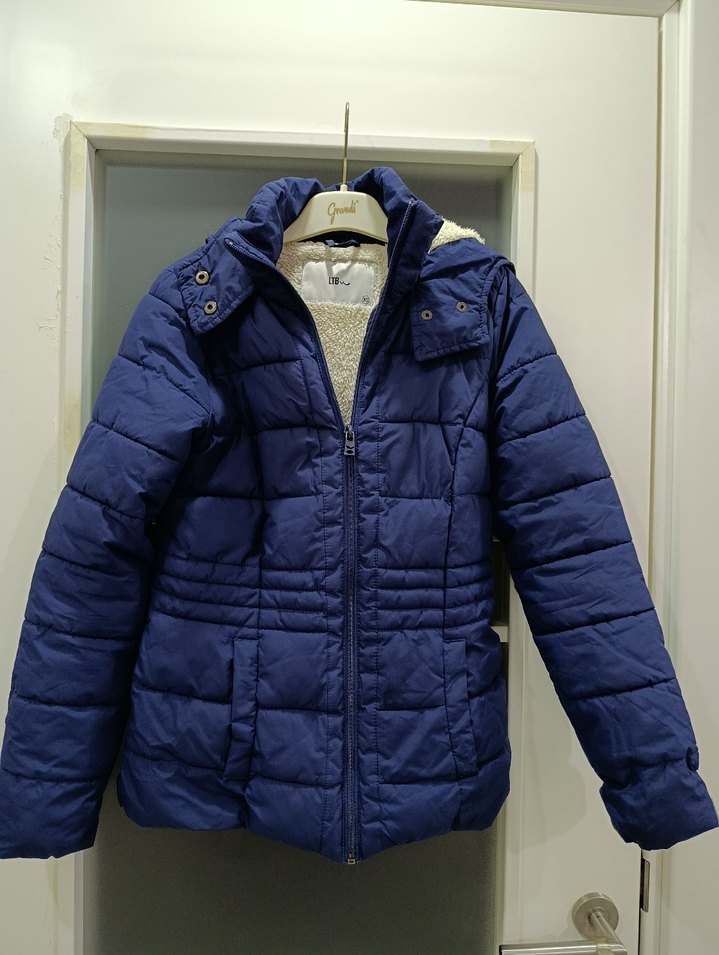 Mavi, kürklü detaylı, uzun kollu ve normal uzunlukta kadın kışlık mont. Yumuşak ve sıcak kumaştan, dış mekan kullanımı için uygundur. omuzdan boy 65 cm göğüs 44 cm, XS beden kapüşonu sabit defosuz fakat iç etekte tülermeler mevcut resme bakabilirsiniz