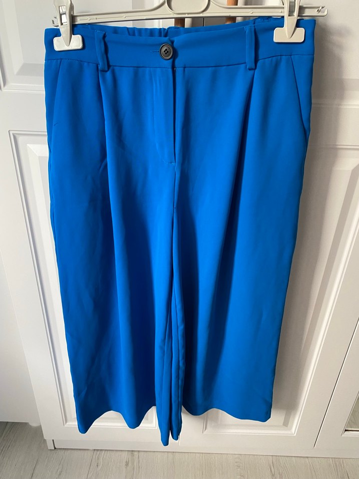 Mavi renkte, sentetik kumaştan üretilmiş, midi boy, pilili ve regular fit kadın pantolon. Minimalist ve sokak stiline uygun, ofis için idealdir.