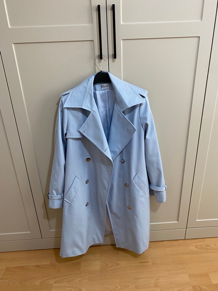 Pastel mavi renkte kadın midi trençkot, düğmeli ve yakalıdır. Uzun kollu, normal kesim ve yumuşak sentetik kumaştan üretilmiştir. Günlük kullanıma uygundur. Az giyildi
