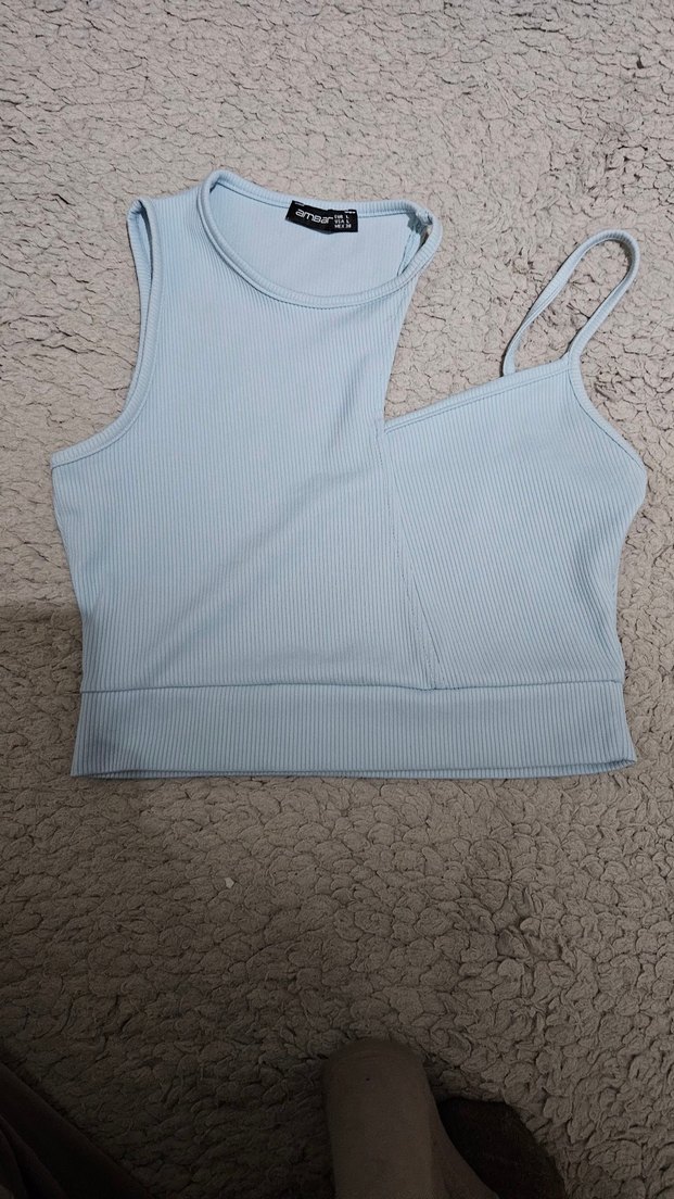 Mavi renkli, mini uzunlukta, askısız ve kolyessiz kadın atlet. Yumuşak sentetik kumaştan, rahat ve şık bir dış mekan sokak stili sunar.