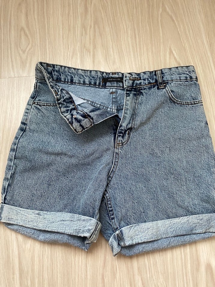 Gri-mavi tonlarda, bol kesim mini denim şort. Günlük kullanıma ve rahat sokak stiline uygun, manşetli ve desensiz.