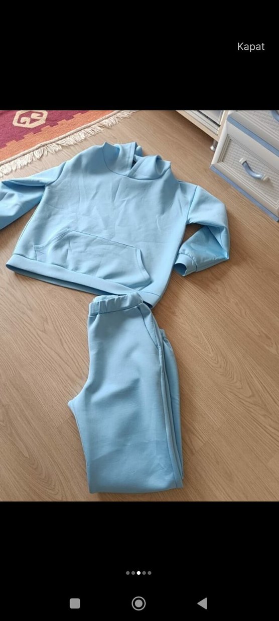 bir iki defa kullanıldı sıfırdan farksız sadece gösterdiğim bir iki noktada yanlış makineden dolayı sıkıntı oluşmuş başka hiçbir sıkıntısı yok s m L beden uyumlu bol model ilk fotoğraftaki gibi rengi