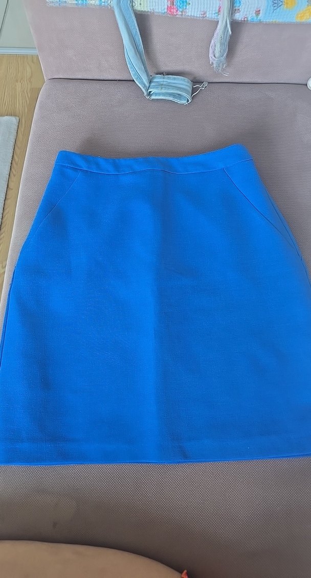 Yumuşak ve sıcak kumaştan, düz ve desen içermeyen mavi mini etek. Rahat ve şık, renkli ve sade tasarıma sahip.