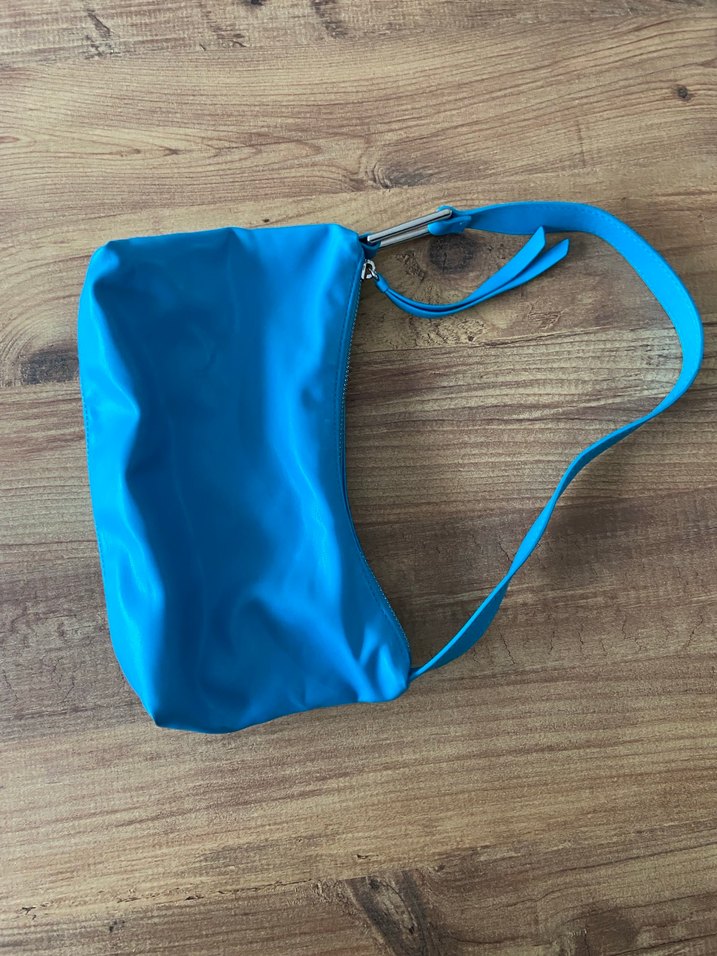 Mavi renkli, fermuarlı, sentetik kumaştan kadın çantası. Minimalist, düz tasarımlı, pastel tonlarda, outdoor sokak stiline uygun.