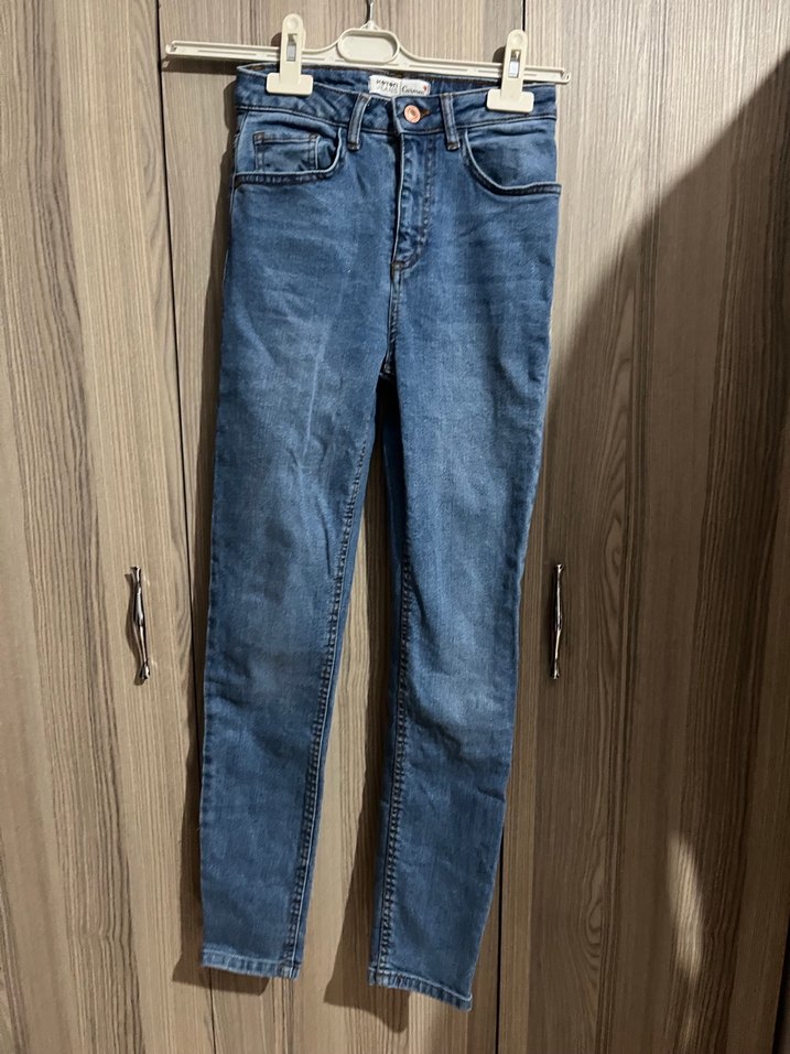 Mavi renkli, normal boy ve dar kesim kadın denim pantolon.