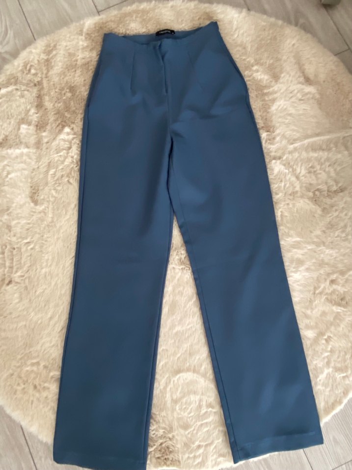 Mavi renkli, normal kesim ve midi boy kumaş pantolon, yumuşak ve sıcak bir dokuya sahiptir. Ofis kullanımı için uygun, zahmetsiz şıklık sunar.