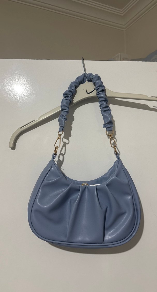 Pastel mavi renkte, pilili tasarıma ve büzgülü sap özelliğine sahip kadın çantası. Sentetik kumaştan, hafif batik desenli, gündelik sokak stili için uygun. İçi geniştir baya ürün alır defosu vs yoktur