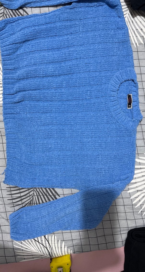 Mavi renkli, düz örgü kadın kazak, yuvarlak yaka ve uzun kolludur. Rahat kesimiyle günlük kullanıma uygundur. yaka kısmında görünen ve alt kısımda görünen defosu vardır hafif