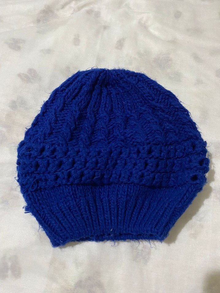 Mavi renkli, örgü detaylı, rahat ve renkli kadın bere. Günlük kullanım için uygun.