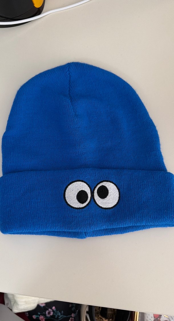 Mavi örgü bere, yumuşak ve sıcak polar astar ile rahatlık sağlar, önünde eğlenceli göz nakışı vardır.