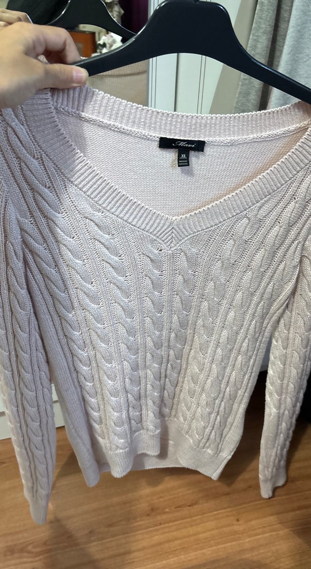 V yaka ve uzun kollu, yumuşak yün örgüden yapılmış, normal midi uzunlukta, sade ve deseniz, rahat kesim gri kadın kazak. Xs beden kalıbı geniş