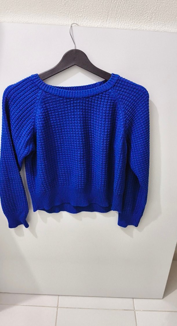 Mavi örgü kadın kazak, bisiklet yaka ve uzun kollu. Rahat kesim ve normal boyda, günlük sokak stili için uygun. Sade ve konforlu tasarım.
