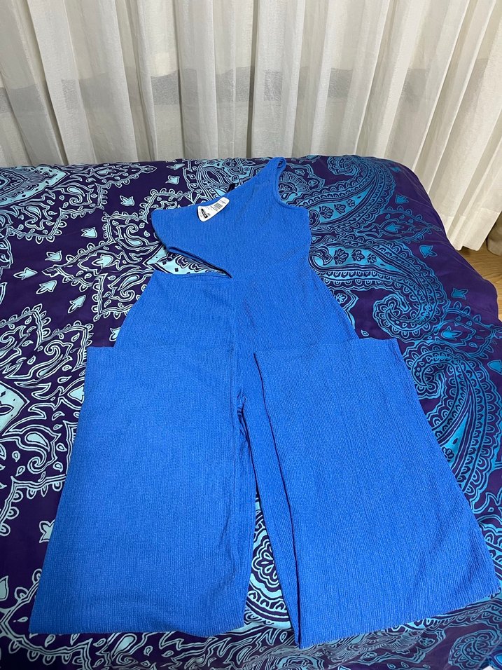 Dar kesim, S beden askısız, koyu mavi batik desenli örgü dokulu uzun kollu tulum. Rahat, bohem tarzıyla açık hava kullanımı için uygundur.