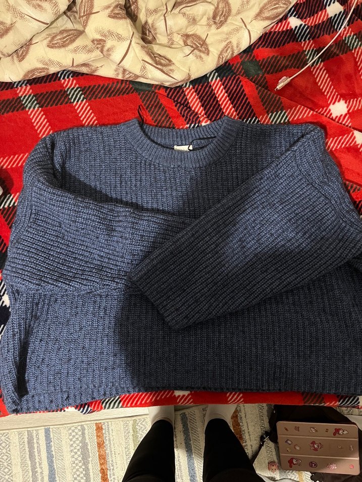 mavi renkli, örgü yün kazak, yuvarlak yaka ve uzun kollu, bol kesim rahat ve sıcak bir günlük kullanım ürünü. crop