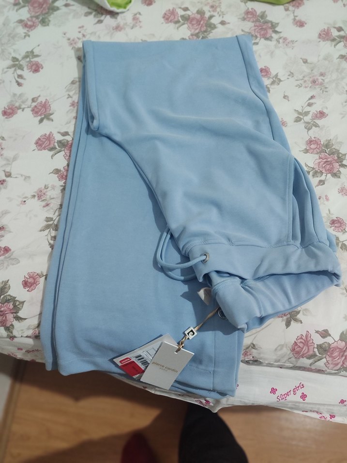 Pastel mavi kadın eşofman altı, pamuklu kumaştan, bol kesim ve normal midi boyda, fermuarlı ceplerle günlük rahatlık sunar. Pierre cardin kalitesi. rahat kesim XL a uygun olur